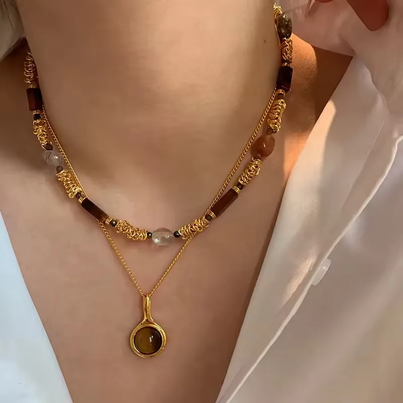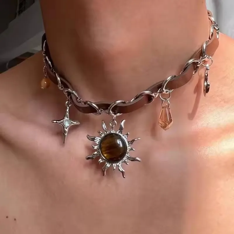 خمر الجلود البني حجر الشمس قلادة مطرز المختنق سلسلة الترقوة قلادة للنساء فريد Y2K شخصية الجرونج مجوهرات